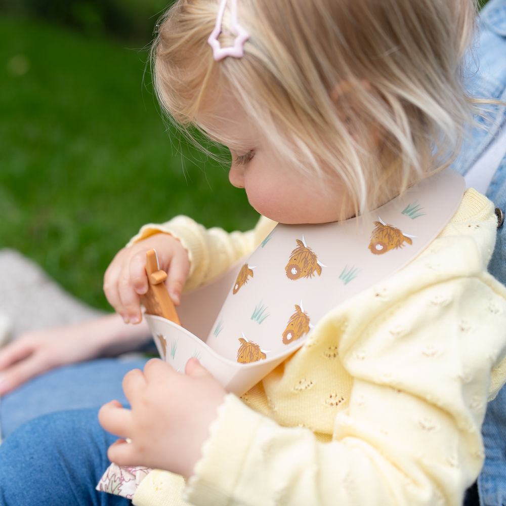 - Protect your little one’s clothes with our gorgeous Highland cow design silicone bib.
